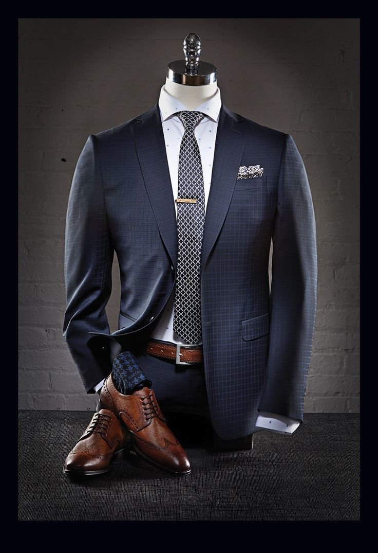 A men's dark blue checked suit with a white dress shirt, patterned tie, pocket square, brown leather dress shoes, and a sock on one shoe, displayed on a mannequin against a gray background.